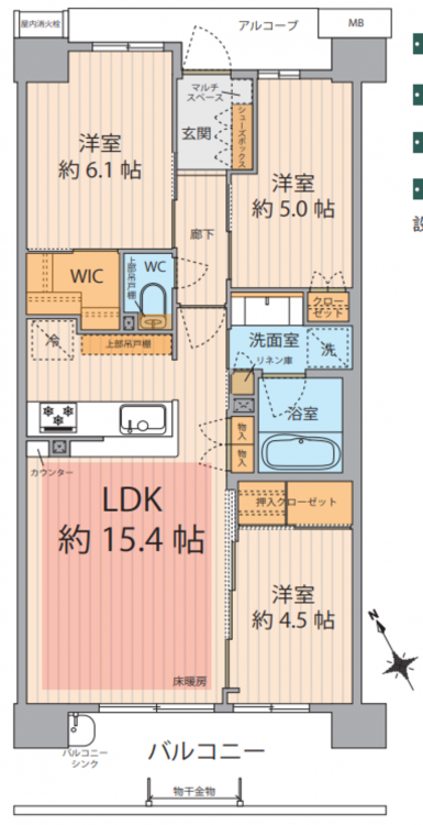 - 床暖房、システムキッチン、食器洗浄乾燥機、浴室乾燥機、洗浄便座、ウォークインクローゼット、複層ガラス、オートロック、ペット可、エレベーター、ディスポーザー、ビルトイン浄水器、宅配ボックス